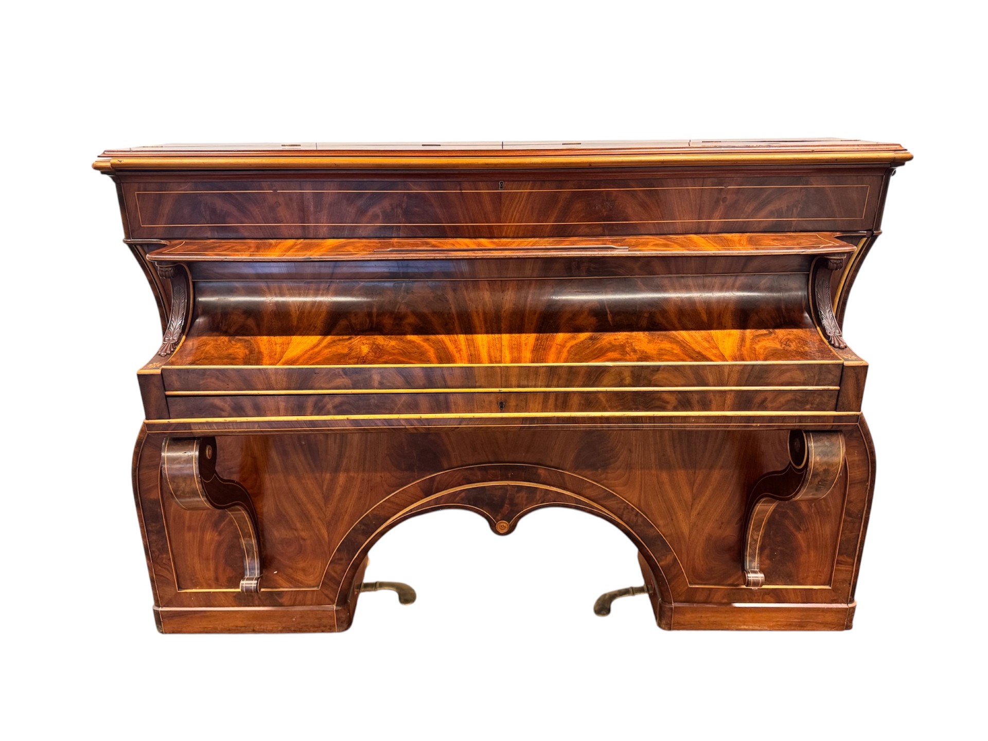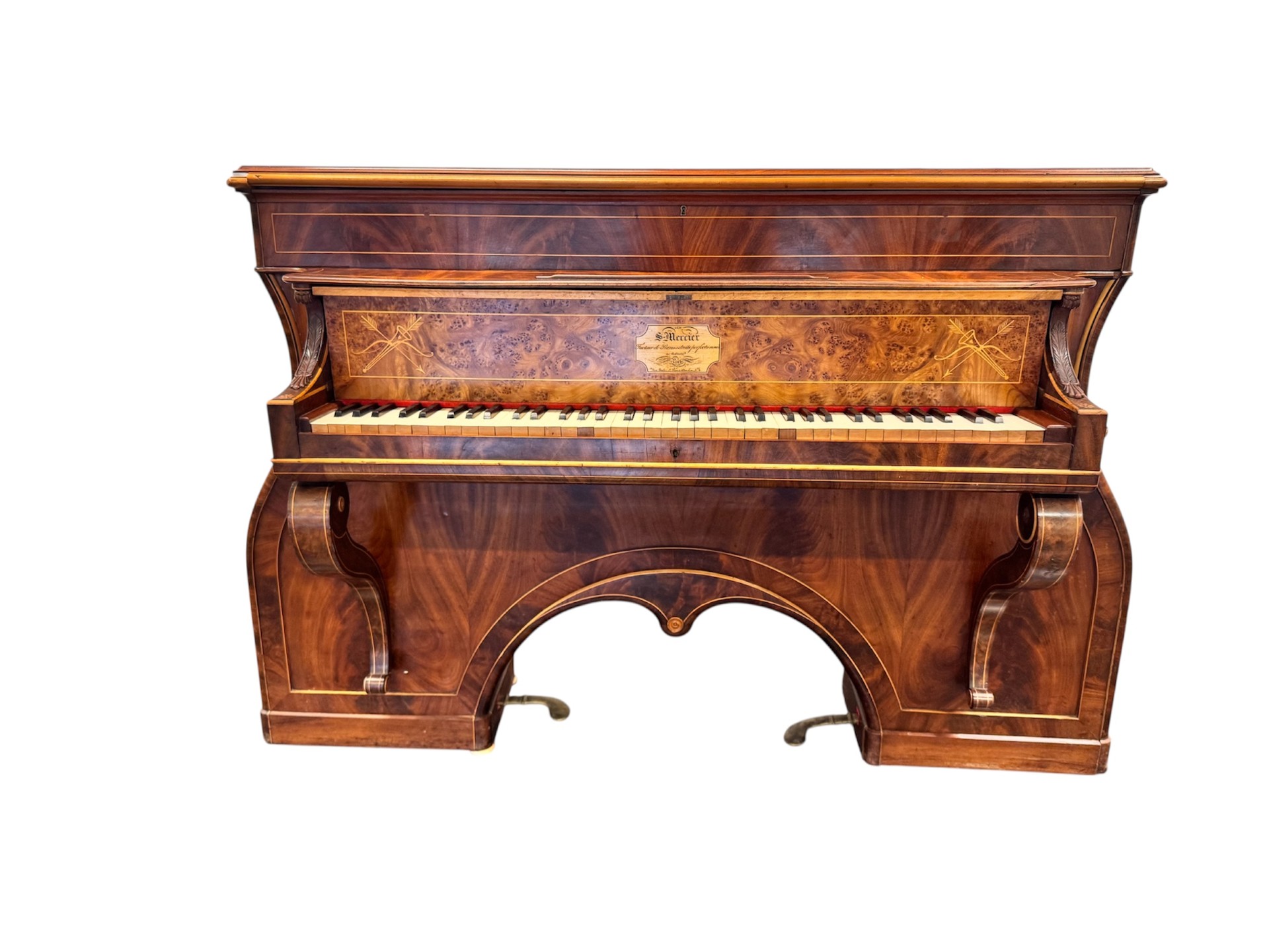 In 1830, Sébastien Mercier began working as an independent piano maker. Before that, he became familiar with the rise of the upright piano in France while working in the workshop of Roller & Blanchet, who were pioneers in making more compact pianos for the bourgeoisie. By arranging the strings diagonally from the upper left to the lower right, they were able to use longer strings within a case of limited height. This principle created a semicircular recess at the bottom, which gave these instruments names such as “piano-pont,” “niche de chien,” or “dog kennel.” Mercier’s instruments were highly refined, both in terms of their mechanism and their finish. They were therefore intended for the salons of the wealthier bourgeoisie.